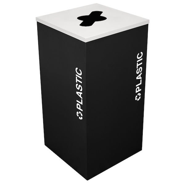 Kaleidoscope Collection Square recycling receptacle with Plastic decal in Black Texture finish. Just like a real Kaleidoscope, these recyclers offer consumers the ability to establish their Recycling Centers in a varying selection of colors and patterns to meet their needs. As the facility needs change, so too can the Kaleidoscope Collection with the addition of units that fit snugly together or up against corners or walls. ADA Complaint and constructed of fire-safe steel. Easy to remove steel top finished in Silver Star powder-coat with comingle opening for plastics. Easy to read, pre-applied WHITE decals on 2 sides of the units to indicate waste stream. Rigid plastic liners with ample 24-gallon capacity. Four heavy-duty feet keep the units slightly elevated to allow for air circulation and help restrict mold and mildew growth and unsightly discoloration of floor surfaces from mop aroundin ring
