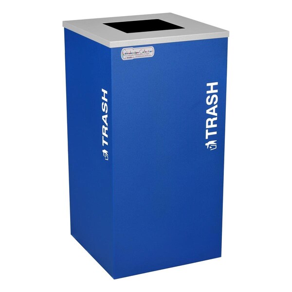 Kaleidoscope Collection 18-gal recycling recptacle with square top and Trash decal in Royal Blue Texture finish. Just like a real Kaleidoscope these recyclers offer consumers the ability to establish their Recycling Centers in a varying selection of colors and patterns to meet their needs. As the facility needs change so too can the Kaleidoscope Collection with the addition of units that fit snugly together or up against corners or walls. ADA Complaint and constructed of fire-safe steel. Easy to remove steel top finished in Silver Star EXL-Coat powder-coat with removable finger-print proof Black Texture EXL-Coat finished insert. Insert openings are dedicated to desired waste stream; 4.5" circle for Bottles-Cans & Plastic 2 inch Paper Slot and an 8 inch square or half moon Trash opening. Easy to read pre-applied White decals on 2 sides of the units to indicate waste stream. Rigid plastic liners with ample 18-gallon capacity on the square units and 8-gallon capacity on the half-round. Four heavy-duty feet keep the units slightly elevated to allow for air circulation and help restrict mold and mildew growth and unsightly discoloration of floor surfaces from "mop around" ring.