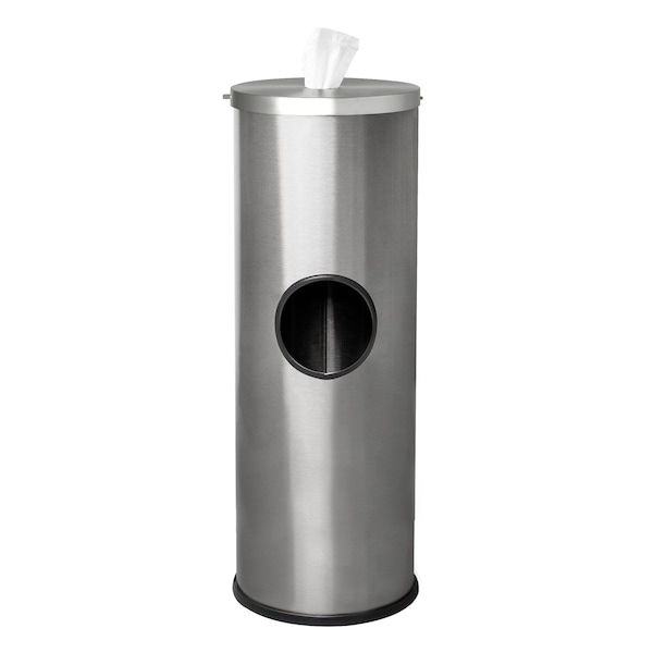 Stainless steel sanitizing wipe dispenser, Designed for hygienic, touch-free use with wipes pulled through 2in opening on lid and disposed of in the 5in Trash opening on side. Leak proof and rust proof 3-gallon plastic liner remains hidden inside the unit base, simply lift unit to empty liner. Compatible with most center-pull bagged wipe rolls up to 9.5in in diameter - Disinfectant Wipes, Anti-Bacterial Wipes or Sanitizing Wipes and more. Decorative double beaded base adds elegance and stability with a full rubber gasket to protect floor surfaces. Ideal for Health Clubs, Doctors' & Medical Offices, Restrooms, Shopping Cart Corrals at Retail and more. Contains over 60% recycled material and 100% post-consumer recyclable