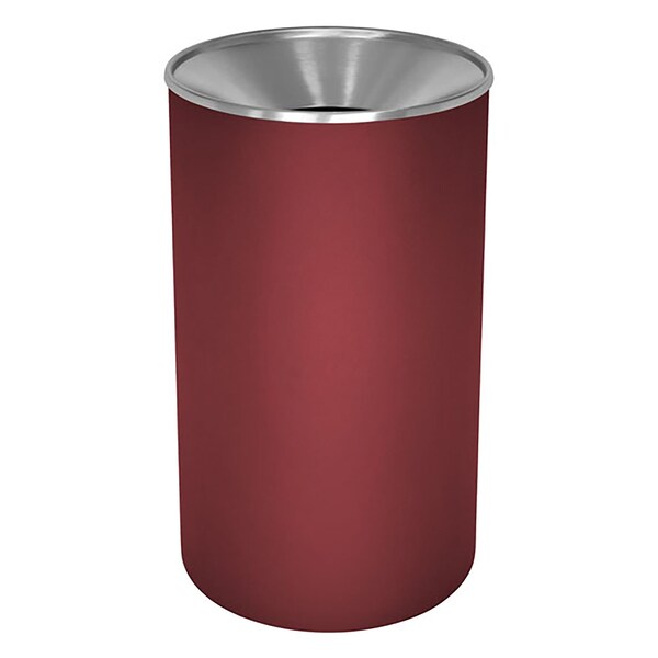 Premier Series heavy-duty indoor 33-gal waste receptacle with Burgundy textured body and stainless steel funnel top w/8in opening. Durable steel features seamless construction with a polished satin finish. Includes an LLDPE plastic liner with lift holes. The liner base resin meets UL94 flammability standard. Four heavy duty feet keep the bottom of this unit slightly off the ground. Contains over 30% recycled material, Stainless Steel over 60%, and 100% post-consumer recyclable