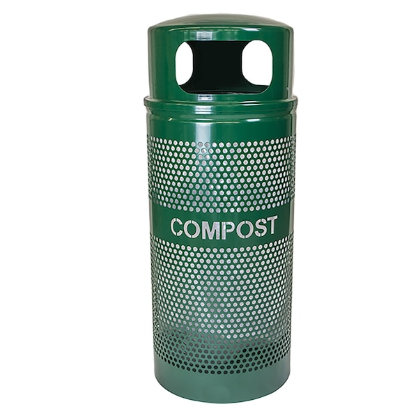 Landscape Series 34-gal perforated Compost Receptacle in Hunter Green Gloss powder-coat finish with dome top. Three 3 5in x 10in trash openings.Body features laser cut COMPOST graphic. Domed lid is secured to unit with plastic coated steel cable to prevent theft and vandalism. Steel retainer bands hold liner bags in place. Pre-drilled mounting holes in back of unit allow for mounting to poles, walls or fences. Pre-drilled 1in holes in bottom of unit allow for in-ground mounting with the anchor kit included. Optional mounting vracket available B-1022 . Contains over 30% recycled material and 100% post-consumer recyclable. ADA Compliant. .