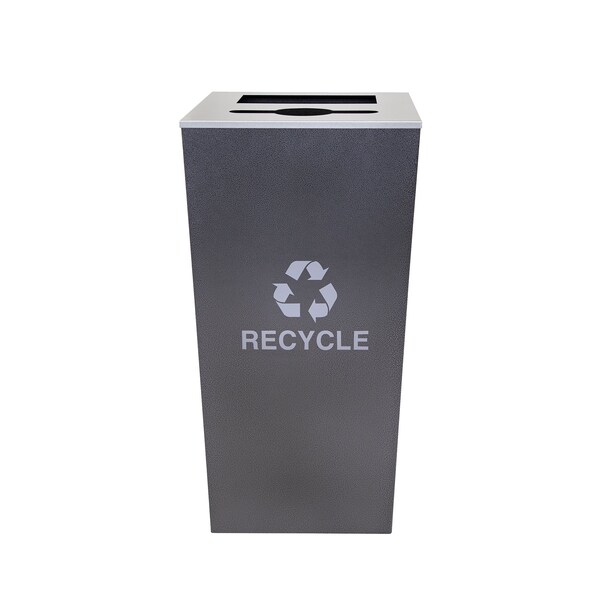 Metro Collection XL 34-gal capacity combination Trash/Recycling Receptacle in a Hammered Charcoal finish. Collar is finish in platinum powder coat. Silver vinyl decals. Clean lines and quality construction merge to create a Recycling Receptacle that is as visually stunning as it is functional. Metro Collection Recycling Receptacles complement any decor, traditional or contemporary. ADA Compliant and constructed of fire-safe steel. Two2 ridgid 17 gallon plastic liners and divided lid allow for sorting of Trash & Recyclables at a single collection point. Four heavy-duty feet keep the units slightly elevated to allow for air circulation and help restrict mold and mildew growth and unsightly discoloration of floor surfaces from mop aroundin rings. Optional caster kit 4-2in casters available for superior maneuverability. Contains over 30% recycled material and 100% post-consumer recyclable