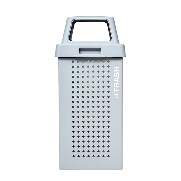 Kaleidoscope Collection XL Outdoor 36-gal trash receptacle. Perforated steel finished in Hammered Grey Gloss Exterior with white TRASH decals applied vertically on all 4 sides. Matching LLDPE plastic dome top with 9.9in x 5.8in trash openings on 4 sides. Lid is secured to unit with plastic coated steel cable and pocket handles designed to provide liner bag retention. Includes in-ground mounting anchor