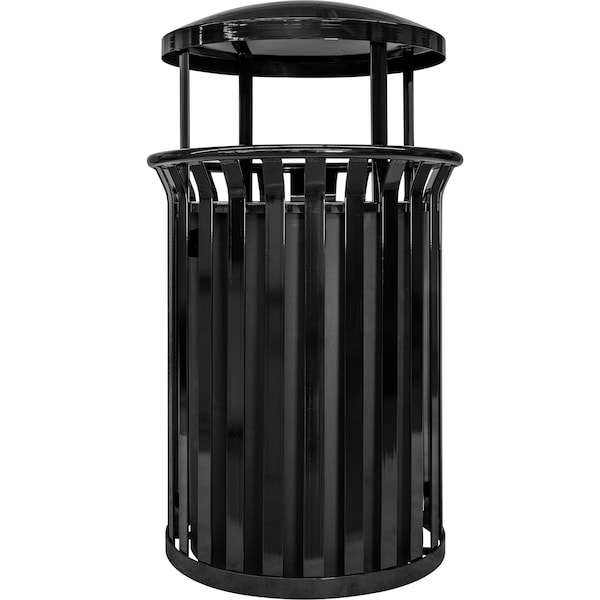 Classic Streetscape heavy-duty, all steel, 35.5 gal capacity outdoor trash receptacle with rain canopy in Black Gloss. These impressive heavy-duty, all steel Trash Receptacles are durable enough for any outdoor climate. Finish is weather resistant EXL-COAT Powder Coat. Solidly built with 1-1/2in wide x 3/16in thick welded steel bars. Bottom consists of steel U-channels that allows securing to the ground if desired. Adjustable leveling glides keep unit stable on uneven surfaces. Includes a removable LLDPE plastic liner with lift openings. Contains over 30% recycled material and 100% post-consumer recyclable