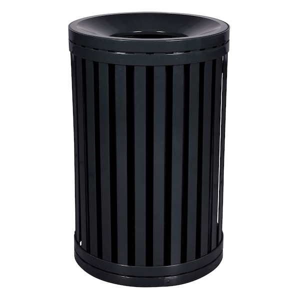 South Hampton Streetscape Heavy duty, all steel, 45 gallon capacity outdoor trash receptacle with funnel top. Durable enough for any climate thanks to weather resistant EXL-COAT powder coat finish. Solidly built with thick welded steel bars. Funnel top with circle opening for waste. Bottom consists of steel U-channels so unit can be secured to the ground if desired. Adjustable leveling glides keep unit stable on uneven surfaces. Includes a removable LLDPE plastic liner with lift openings. The liner base resin meets UL94 Flammability Standard. Contains over 30% recycled material and 100% post-consumer recyclable