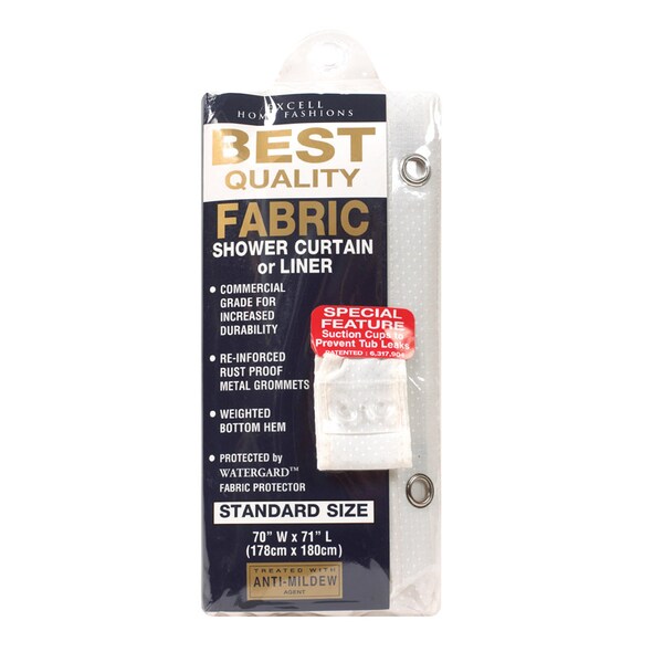 This heavy weight mildew-resistant liner is made of super soft vinyl. Use it to protect a fabric shower curtain or hang it all by itself. This is a 70 x 71 inch vanilla fabric shower curtain or liner made of 100 percent polyester fabric with metal grommets and suction cups to adhere to tub and shower surfaces. It has a weighted bottom hem treated with Watergard and anti-mildew agent.