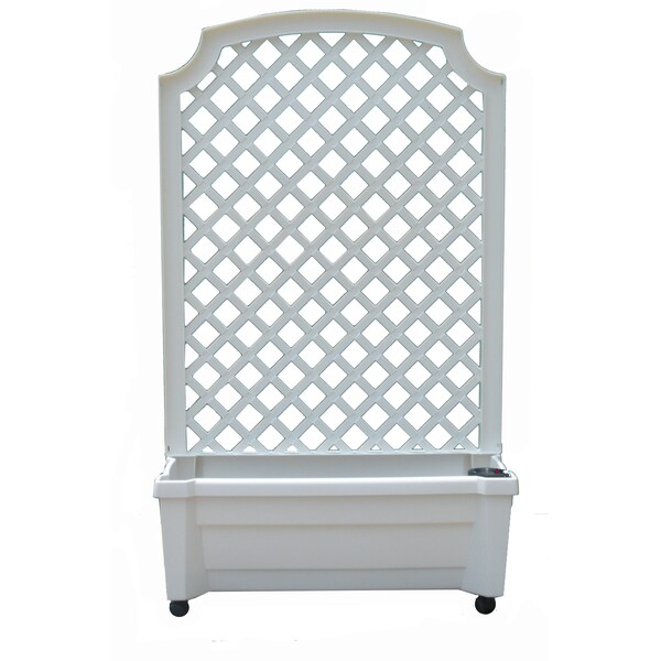 Calypso Planter with Trellis - White - Planter has built-in water reservoir with water level indicator and double bottom with 2.5 gal capacity. Includes 4 wheels - 2 lock. For indoor/outdoor use (does not leak). Assembled size: 31" W x 13.5" D x 53" H
