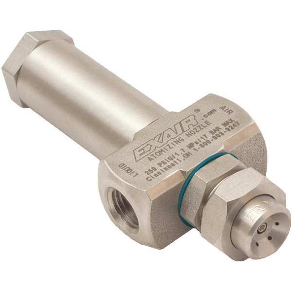 Atomizing Spray Nozzle, Fluid Delivery Type Pressure, Fluid Delivery Speed Low, Flow Rate 18 to 60 gph, Spray Pattern @ 15 In. 11 in dia, Material Stainless Steel, Thread Size 1/4 FNPT, Air Consumption 14.0 to 27.9 scfm, Max. Working Pressure 250 psig, Features Can Be Used with Liquids Up to 800 Centipoise, No Drip External Mix Nozzles Offer The Highest Flow Rates