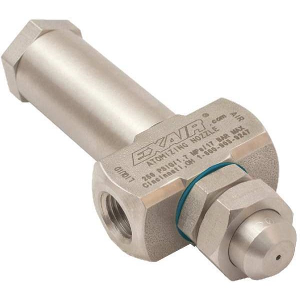 Atomizing Spray Nozzle, Fluid Delivery Type Pressure, Fluid Delivery Speed Low, Flow Rate 3.0 to 66 gph, Spray Pattern @ 15 In. 9 in dia, Material Stainless Steel, Thread Size 1/4 FNPT, Air Consumption 2.8 to 10.2 scfm, Max. Working Pressure 250 psig, Features No Drip Internal Mix Nozzles Produce The Finest Atomization and Can Be Used with Liquids Up to 300 Centipoise