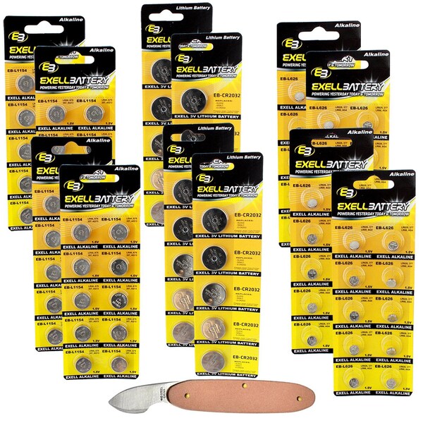 Exell Battery Essentials Kit Includes 3V Lithium Coin Cell Batteries Sizes CR2032, 1.5V Alkaline Batteries Sizes L1154 L626 and Watch Case Opener