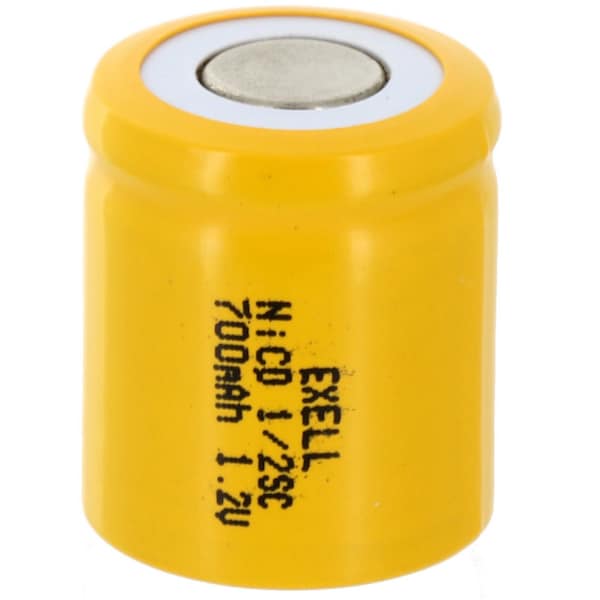 Exell 1/2SC NiCD 700mAh 1.2V Flat Top Rechargeable Battery Consumer Applications: Widely used in radio controlled devices, electric tools and toys, electric mopeds, meters, two radios, hybrid automobiles, electric razors, toothbrushes, cameras, camcorders, mobile phones, pagers, instruments/equipment, high power static applications Telecoms, UPS and Smart grid, and numerous other applications. Exell 1/2SC NiCD 700mAh 1.2V Flat Top Rechargeable Battery Specifications Voltage: 1.2V Amperage: 700mAh Chemistry: Nickel Cadium NiCD Height: 1.02in Diameter: 0.91in Terminal Types: Flat Top A NiCD Assembly Cell Battery Information Excellent quality and provide constant power electric current for your power hungry devices and some solar lights and solar applications. Low internal resistance, ideal for rapid high current discharge Excellent battery cycle life: 1000 times Ni-Cad battery can be charged and discharged for up to 1000 times Environmentally Friendly Ni-Cad can be recycled If use once a day, Ni-Cad batteries can last up to 3 years. It is a good practice to do deep-discharge or complete discharge at least once 4 to 8 weeks. Deep discharge complete discharge is important for Ni-Cad not to develop memory effects. Compared with other types of rechargeable cells, Ni-Cad batteries offer good cycle life and performance at low temperatures with a fair capacity but its significant advantage is the ability to deliver practically its full rated capacity at high discharge rates discharging in one hour or less