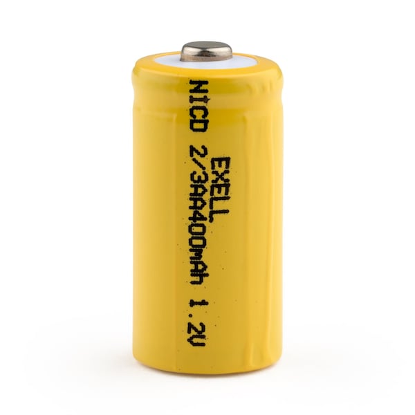 Exell 2/3AA 1.2V 400mAh NiCD Rechargeable Button Top Battery Consumer Applications: Widely used in radio controlled devices, electric tools and toys, electric mopeds, meters, two radios, hybrid automobiles, electric razors, toothbrushes, cameras, camcorders, mobile phones, pagers, instruments/equipment, high power static applications Telecoms, UPS and Smart grid, and numerous other applications. Exell 2/3AA 1.2V 400mAh NiCD Rechargeable Button Top Battery Specifications Voltage: 1.2V Amperage: 400mAh Chemistry: Nickel Cadium NiCD Height: 1.16in Diameter: 0.56in Terminal Types: Button Top NiCD Assembly Cell Battery Information Excellent quality and provide constant power electric current for your power hungry devices and some solar lights and solar applications. Low internal resistance, ideal for rapid high current discharge Excellent battery cycle life: 1000 times Ni-Cad battery can be charged and discharged for up to 1000 times Environmentally Friendly Ni-Cad can be recycled If use once a day, Ni-Cad batteries can last up to 3 years.