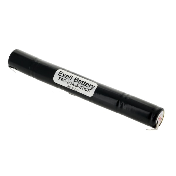 Exell 6V 700mAh NICD with Tabs For Emergency Lights for Emergi-lite 002277, Emergi-lite 850.0063 Consumer Applications Widely used in radio controlled devices, electric tools and toys, electric mopeds, meters, two radios, hybrid automobiles, electric razors, toothbrushes, cameras, camcorders, mobile phones, pagers, medical instruments/equipment, high power static applications Telecoms, UPS and Smart grid, and numerous other applications. High capacity, better power performance, lower internal impedance, more stable performance, safer and more reliable, better storage performance. Exell 6V 700mAh NICD with Tabs Specifications Voltage: 6V Amperage: 700mAh Chemistry: NiCD Cell Count: 5 x 2/3A Connector Type: Packed as stick end to end with solderable Tabs Length: 0.67 17 mm Diameter: 5.7 145mm Height: 1.06 27mm Weight: 0.25 lbs Exell 6V 700mAh NICD with Tabs Features High quality Ultra High Capacity NiCD battery Exact Compatible With for standard batteries in all the devices Designed for enhanced performance for high drain applications such as digital cameras, portable audio devices, hand held games, 2way radios, PDAs, and other portable high drain digital electronics Excellent quality and the best price Replace for emergency light batteries, including: Emergi-lite 002277 Emergi-lite 850.0063 Exell 6V 700mAh NICD with Tabs General Applications: Communication Equipment: cordless phones, cell phones, walkie-talkie, frs radio, gmrs radio Lighting: Emergency lights, solar lights, searchlights, flashlights, exit lights Electronic toys: remote control car, remote control boats, aircraft, model aircraft, hobby packs Power tools: electric drills, planers, saws Other uses: electric shavers, razors, massagers, electric toothbrush Suitable uses: cordless phone, solar lighting, electrical drill, shaver, emergency lighting, back-up power, cordless tool, power tool, flashlight, torch, barcode scanner, etc.