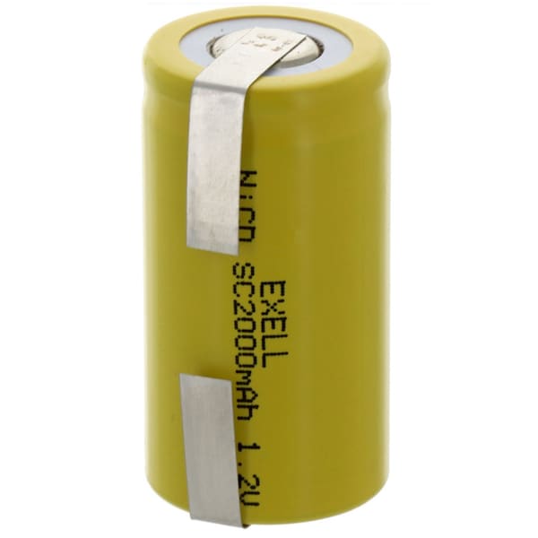 Exell SubC 1.2V 2000mAh NiCD Rechargeable Battery with Tabs Consumer Applications: Widely used in radio controlled devices, electric tools and toys, electric mopeds, meters, two radios, hybrid automobiles, electric razors, toothbrushes, cameras, camcorders, mobile phones, pagers, instruments/equipment, high power static applications Telecoms, UPS and Smart grid, and numerous other applications. Exell SubC 1.2V 2000mAh NiCD NiCD Rechargeable Battery with Tabs Specifications Voltage: 1.2V Amperage: 2000mAh Chemistry: Nickel Cadium NiCD Height: 1.65in Diameter: 0.87in Terminal Types: Tabs NiCD Assembly Cell Battery Information Excellent quality and provide constant power electric current for your power hungry devices and some solar lights and solar applications. Low internal resistance, ideal for rapid high current discharge Excellent battery cycle life: 1000 times Ni-Cad battery can be charged and discharged for up to 1000 times Environmentally Friendly Ni-Cad can be recycled If use once a day, Ni-Cad batteries can last up to 3 years. It is a good practice to do deep-discharge or complete discharge at least once 4 to 8 weeks. Deep discharge complete discharge is important for Ni-Cad not to develop memory effects. Compared with other types of rechargeable cells, Ni-Cad batteries offer good cycle life and performance at low temperatures with a fair capacity but its significant advantage is the ability to deliver practically its full rated capacity at high discharge rates discharging in one hour or less