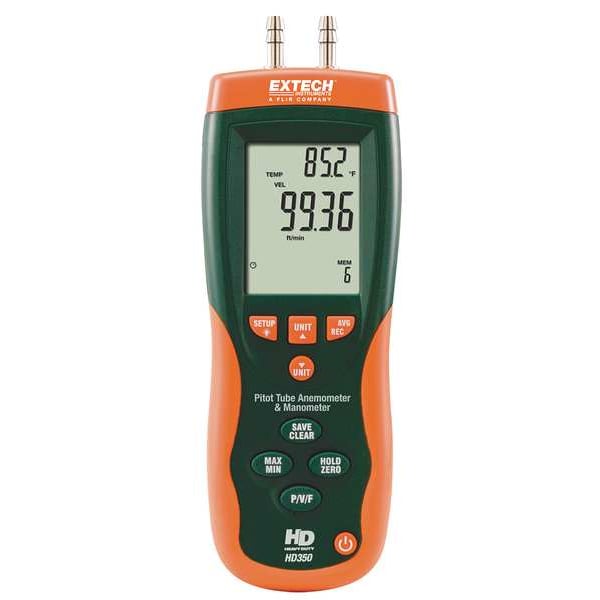Handheld Digital Manometer, Maximum Pressure 20 in wc, Minimum Pressure -20 in wc, Pressure Accuracy +/-0.3 Percent Full Scale, Process Connection Size 5/8 in, Process Connection Type Hose Barb, Includes Batteries Batteries Included, Digital Display Features Backlit LCD, NIST Traceable Certificate No, Series Not Applicable, Maximum Air Volume 99,999 cfm, Maximum Air Velocity 15,733 fpm, Pressure Units mbar, Pa, psi, Air Velocity Units knot, mph, Air Volume Units cfm, Auto Power Off Yes