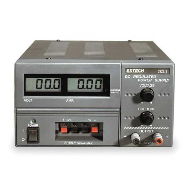 Triple Output DC Power Supply, Voltage Output (1) 0 to 30V DC, Current Output (1) 0 to 3 ADC, Voltage Output (2) 5V DC, Current Output (2) 0.5 ADC, Voltage Output (3) 12V DC, Current Output (3) 0.5 ADC, Line Regulation 0.05 Percent + 10 mV, Load Regulation 0.05 Percent + 10 mV, Meter Type 2 (3-Digit) LCD, Input 110/220 V AC, 50/60 Hz, Includes Power Cord, Manufacturers Warranty Length 2 yr