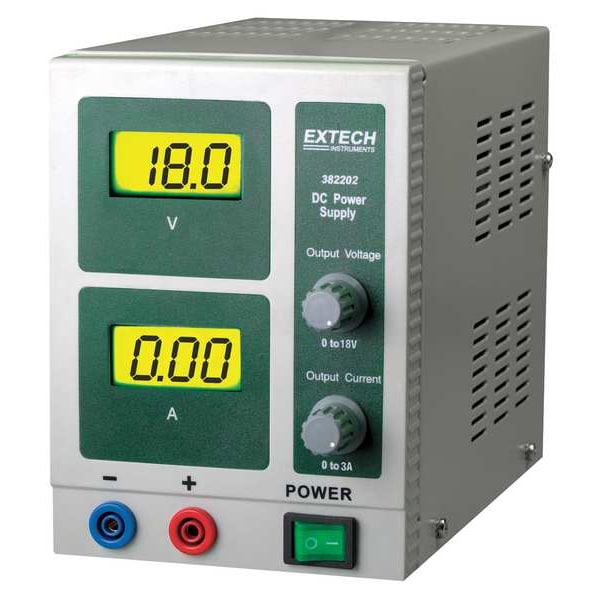 DC Power Supply, Output Volts (DC) 0 to 18V, Output Current (Amps) 0 to 3 A, Ripple Volts Regulation 0.5mV, Line Volts Regulation 0.1 Percent + 3mV, Load Regulation Less Than0.01 Percent + 2mV/ Less Than0.2 Percent + 3mA, Line Regulation Less Than0.2 Percent + 3mA, Meter Type Dual LCD, 115/230V AC Input Voltage, Includes AC Power Cord, Manufacturers Warranty Length 2 yr, No Calibration Certificate