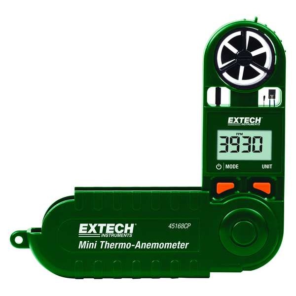Anemometer, Minimum Velocity Measured 60 fpm, Probe Diameter 1 in, Probe Type Rotating Vane, Maximum Velocity Measured 3,937 fpm, Minimum Dew Point Measured -4 Degrees F, Minimum Hot Wire Probe Length Not Applicable, Minimum Operating Temperature 5 Degrees F, Minimum Relative Humidity Measured 0.1 Percent, Includes Lanyard, Relative Humidity Accuracy +/-3 Percent, Temperature Accuracy +/ 1.8 Degrees , Wind Speed Units ft/min, km/hr, knot, m/sec, mph, Air Velocity Resolution 2 fpm