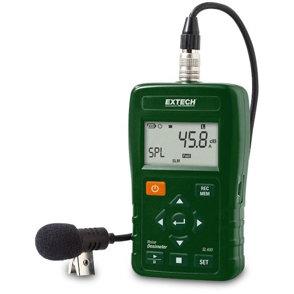 Noise Dosimeter, Includes Battery, Microphone Condenser 32 in, Digital Display Screen Type LCD, Frequency Weighting A, C, Z, Maximum Frequency Measurement 8 kHz, Maximum Sound Level Measurement 143 dB, Minimum Frequency Measurement 20 Hz, Minimum Sound Level Measurement 30 dB, Number of Records Stored 1,000,000, Sound Level Measurement Accuracy +/-1.4 dB, Sound Level Measurement Resolution 0.1 dB, Interface USB, Features Data Logging, Includes Software Software Included, Range Type Auto, Manual