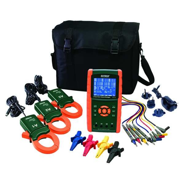 Power Analyzer/Datalogger, Current Channels 4, For Phase Three, Includes (3) 1200 A Current Clamps, (4) Voltage Leads with Alligator Clips, (8) AA Batteries, 2G SD Memory Card, AC Adapter, Carrying Case and Instructions, Maximum AC Current Measured 1,200 A, Peak Capture Yes, Power Factor 0 to 1, Voltage Channels 4, Calibration Frequency 45 to 65 Hz, Communication Protocol RS-232, SD Memory Card, Current Accuracy +/-0.5 Percent +30 Digits