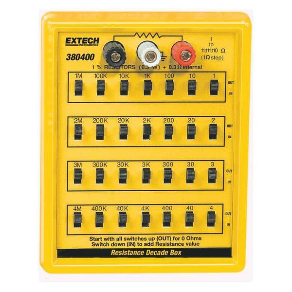 Resistance Decade Box, Range 1 to 11,111,110 ohm, Increments 1 ohm, Accuracy 1 Percent, Number of Decades 7, Height 5 11/16 in, Width 4 5/8 in, Depth 1 3/8 in