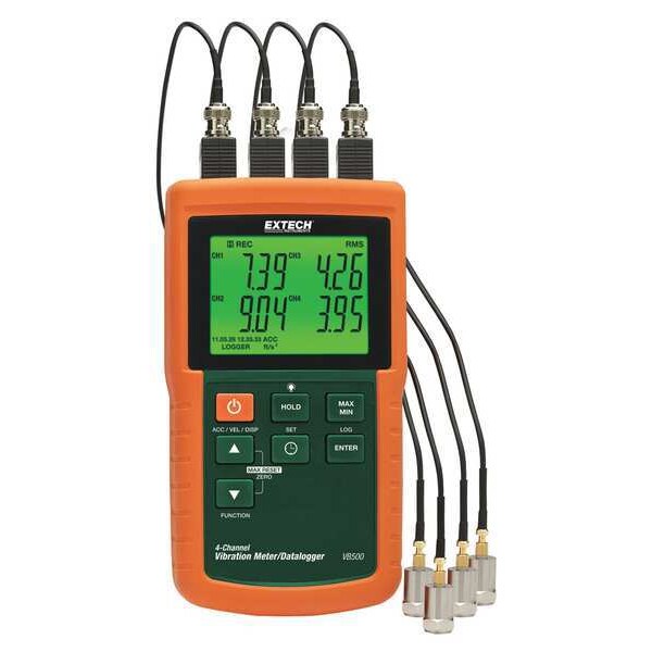 Four Channel Vibration Datalogger, Accuracy +/-(5 Percent + 2 Digits), Auto Power Off Yes, Bearing/Gear Check No, Includes Instructions,(4) Remote Sensors with Magnetic Mounts, (8)AA Batteries, 100 to 240V Universal AC Adapter, SD Card, and Hard Carrying Case