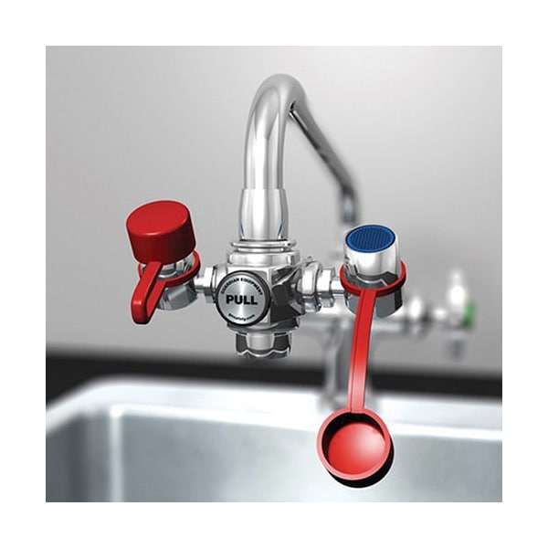 Outlet heads are mounted 3 apartDeliver a soft, aerated flow of waterHeads angle forward toward user; angle can be adjustedPull knob to activate eyewash; push knob or turn off faucet to return to normal faucet operationFloat-off dust covers included
