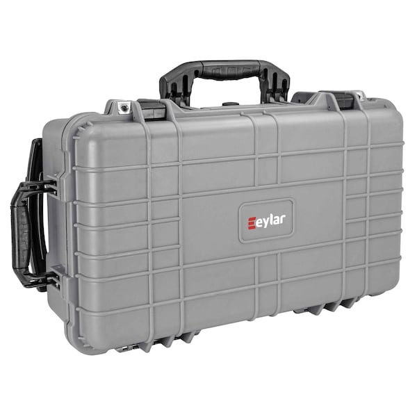The Eylar 22 inch large protective roller camera hard case is designed to secure your equipment for transport or storage. Carry-On size this case can fit in the standard overhead storage compartment for air travel. Check cameras and equipment safely with TSA on flights as we have designed this case to meet TSAs strict requirements for transport on airplanes in the USA TSA luggage lock fittings. Injection molded from reinforced high pressure polypropylene plastic that is waterproof and crushproof. A waterproof seal is formed when the case is latched closed applying pressure to a rubber gasket that is molded to the perimeter of the case. Fully submerged waterproof protection for up to 1 meter. Resistant to extreme heat and freezing cold with a working temperature range of -20F -29C to 140F 60C. This hard camera case comes with 4 layers of foam designed to keep your valuables firmly in place, includes 4 layers of foam; 1egg-crate top liner layer, 2 pull & pluck customizable layers, 1 solid bottom pad layer. Four press & pull snap latches secure the full length of the hard case. Fit multiple full sized DSLR cameras and lenses securely with an inner storage area of : 19.75in x 11in x 7.6in inches. Two pad lock adaptable fittings allow for secure storage at home or on the go. Featuring edge to edge crushproof protection up to 3,000 lbs of directly dispersed weight. Innovative pressure equalization valve allows the case to quickly equalize to different air pressures. Uniform ridges on the top and bottom create a in line stackable design for multi case transport. A deep top lid allows for storage or added protection on the top of the case. Built to last Eylar cases are backed by a limited lifetime warranty.