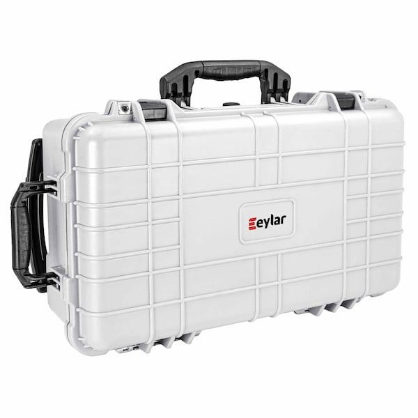 The Eylar 22 inch large protective roller camera hard case is designed to secure your equipment for transport or storage. Carry-On size this case can fit in the standard overhead storage compartment for air travel. Check cameras and equipment safely with TSA on flights as we have designed this case to meet TSAs strict requirements for transport on airplanes in the USA TSA luggage lock fittings. Injection molded from reinforced high pressure polypropylene plastic that is waterproof and crushproof. A waterproof seal is formed when the case is latched closed applying pressure to a rubber gasket that is molded to the perimeter of the case. Fully submerged waterproof protection for up to 1 meter. Resistant to extreme heat and freezing cold with a working temperature range of -20F -29C to 140F 60C. This hard camera case comes with 4 layers of foam designed to keep your valuables firmly in place, includes 4 layers of foam; 1egg-crate top liner layer, 2 pull & pluck customizable layers, 1 solid bottom pad layer. Four press & pull snap latches secure the full length of the hard case. Fit multiple full sized DSLR cameras and lenses securely with an inner storage area of : 19.75in x 11in x 7.6in inches. Two pad lock adaptable fittings allow for secure storage at home or on the go. Featuring edge to edge crushproof protection up to 3,000 lbs of directly dispersed weight. Innovative pressure equalization valve allows the case to quickly equalize to different air pressures. Uniform ridges on the top and bottom create a in line stackable design for multi case transport. A deep top lid allows for storage or added protection on the top of the case. Built to last Eylar cases are backed by a limited lifetime warranty.