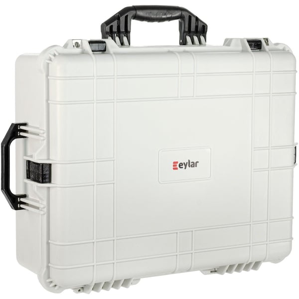The Eylar portable protective hard gun case is designed to be convenient and customizable. A tough exterior creates protection from impact along with a strong seal to keep the box water resistant. On the front is an air pressure equalizer knob to compensate for changes in pressure if travelling. Pluck and pull foam allows for custom compartmentalization so tools can be stored neatly and securely. Clamps on the front and sides to securely close the box with crushproof handles for easy carrying. Uniform grooves to create stacks if needed. Outer: 24.25 inch x 19.43 inch x 9.65 inch Inner: 21.43 inch x 16.5 inch x 7.87 inch Water resistant Shock resistant Pressure equalization valve Multiple layers of pluck and pull foam Black Stackable design with Lockable fittings to meet TSA requirements. 17.6-LBS.