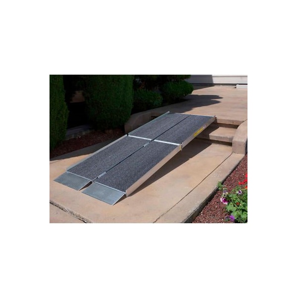 Ez-access suitcase trifold triplefold ramp - 7'l x 29-1/2inw 800 lb. Capacity this ramp, with its unique 3-fold design, offers the length required for wheelchairs and scooters to easily access steps, vehicles, and raised landings. The ramp is designed to be used and carried as a set, or if desired, can be quickly separated into two individual sections, making it even easier to use, carry, and store. By simply removing two hinge pins, the ramp quickly separates into two lightweight halves, each with their own carrying handle. The durable, interlocking hinge provides smoother operation and reduced pinch points. Ramp features an applied high-quality slip-resistant tread and a self-adjusting bottom transition plate for easy conversion from ramp to ground. Unfolds to a 29-1/2in wide platform. Manufactured of welded aircraft-grade aluminum. Features an 800 pound weight capacity and three-year limited warranty.