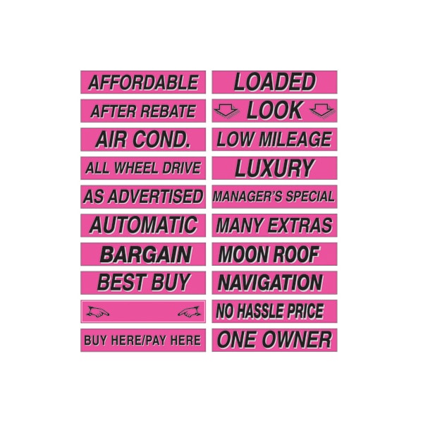 Fluorescent Pink, 3-D shaded design adhesive windshield sign. An inexpensive, yet highly effective sales tool to advertise a feature or selling point! Size: 15" long x 2 3/4" tall. Sold by the dozen {12 per pack}. Neatly shrink wrapped in packs of a dozen with a chipboard backer to prevent curling during storage. Made of durable, watrerproof vinyl, these bright, fluorescent signs demand attention! Each sign is slit on the back for easy application. Removable adhesive allows easy, clean removal. Please note these adhesive signs are not reusable.