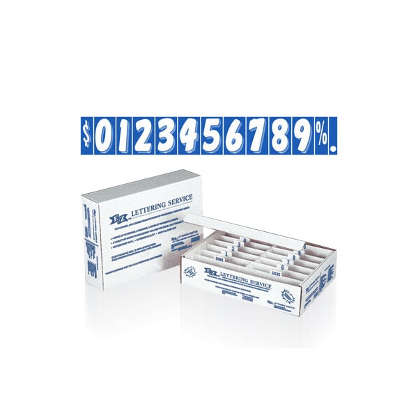 First time ordering or don't know what you want, try our convenient starter kit. This kit contains 20 dozen White on Blue, 3-D shaded design, 7 1/2" tall adhesive windshield numbers and includes a free handy storage box (with easily removed perforated top). The 20 dozen consist of the following: two doz. of #2, #3, #4, #5, #6, #7, #8, #9, #0 and one doz. of #1, #$. These numbers are an inexpensive yet highly effective sales tool to advertise a year model or price. Size: 7 1/2" tall x 4" wide. Neatly shrink wrapped in packs of a dozen {12 decals} with a chipboard backer to prevent curling during storage. Made of durable, waterproof vinyl, these non-fade numbers demand attention! Each number is slit on the back for easy application. Removable adhesive allows easy, clean removal. Please note these adhesive numbers are not reusable. (189 addtional individual numbers)