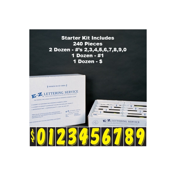 First time ordering or don't know what you want, try our convenient starter kit. This kit contains 20 dozen Yellow on Black, 3-D shaded design, 7 1/2" tall adhesive windshield numbers and includes a free handy storage box (with easily removed perforated top). The 20 dozen consist of the following: two doz. of #2, #3, #4, #5, #6, #7, #8, #9, #0 and one doz. of #1, #$. These numbers are an inexpensive yet highly effective sales tool to advertise a year model or price. Size: 7 1/2" tall x 4" wide. Neatly shrink wrapped in packs of a dozen {12 decals} with a chipboard backer to prevent curling during storage. Made of durable, waterproof vinyl, these bright, non-fade numbers demand attention! Each number is slit on the back for easy application. Removable adhesive allows easy, clean removal. Please note these adhesive numbers are not reusable.