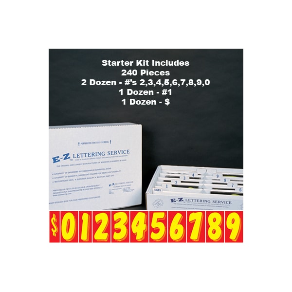 First time ordering or don't know what you want, try our convenient starter kit. This kit contains 20 dozen Yellow on Red, 3-D shaded design, 7 1/2" tall adhesive windshield numbers and includes a free handy storage box (with easily removed perforated top). The 20 dozen consist of the following: two doz. of #2, #3, #4, #5, #6, #7, #8, #9, #0 and one doz. of #1, #$. These numbers are an inexpensive yet highly effective sales tool to advertise a year model or price. Size: 7 1/2" tall x 4" wide. Neatly shrink wrapped in packs of a dozen {12 decals} with a chipboard backer to prevent curling during storage. Made of durable, waterproof vinyl, these bright, non-fade numbers demand attention! Each number is slit on the back for easy application. Removable adhesive allows easy, clean removal. Please note these adhesive numbers are not reusable.