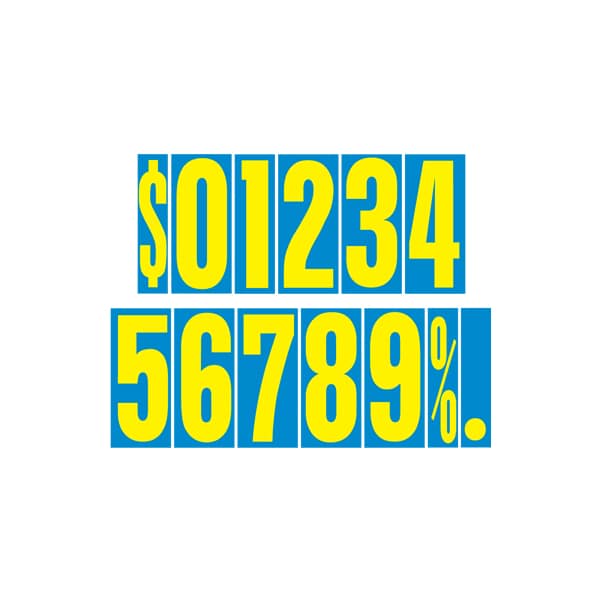 Bright Yellow on Blue background adhesive windshield number. An inexpensive yet highly effective sales tool to advertise a year model or price. Sold by the dozen {12 per pack}. Size: 9 1/2" tall x 4 3/4" wide. Neatly shrink wrapped in packs of a dozen with a chipboard backer to prevent curling during storage. Made of durable, waterproof vinyl, these bright non-fade numbers demand attention! Each number is slit on the back for easy application. Removable adhesive allows easy, clean removal. Please note these adhesive numbers are not reusable. Not sure what to get? Try our Starter Kit. See 222