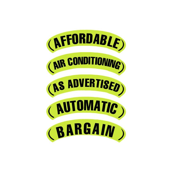 The Perfect Compliment to our Oval Year Model Signs! Made with fluorescent ink, these black on Fluorescent Chartreuse windshield decals are specially designed to work with our Oval Signs {198-C & 196-E}. Use an Arch Slogan over an Oval Sign to emphasize a feature in addition to the year model or use alone, without an Oval Year Model Sign for a great new look. Use multiple Arch Slogans for a layered appearance. Made of waterproof vinyl with a removable adhesive. Each Arch Slogan is approximately 2.75 inches tall x 14 inches long. Sold in neatly shrink wrapped packs of 12.