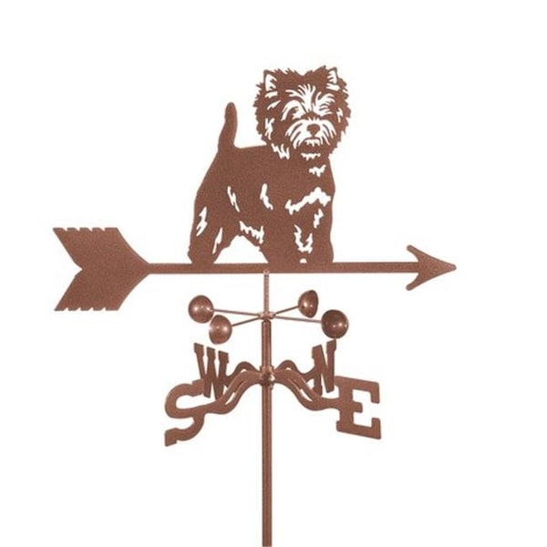 Let this Westie weathervane watch over your home and family -Made of 14-gauge steel, this weathervane adds a touch of beauty in any home or garden setting. Easily installs in less than 1 minute. Intricate laser cut design with 3 protective coatings baked on to prevent rust or fading for years. Complete set includes laser cut top, windcups that have sealed ball bearings to gently turn in any breeze, an EWNS directional that tells the direction the wind is coming from and your choice of mount.