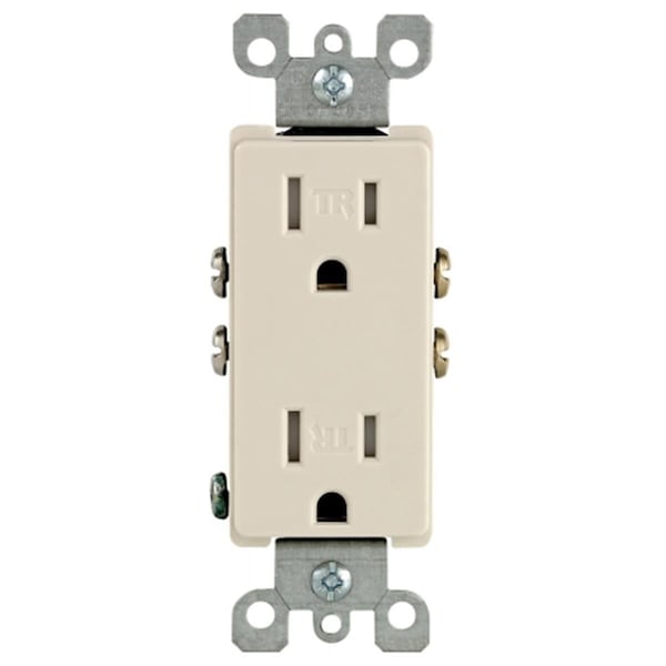 Receptacle -Tamper resistant -Use with copper or clad wire only -UL listed -Decora -15 amp -125 volts -Light almond finish -Length: 4.25-Width: 1.25-Height: 2.1