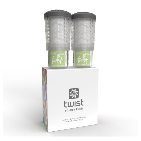 The Twist Passive Air Freshener 2 pack is ready for resell in the perfect point of sale package Your customers see at a glance the look and benefits of the product increasing the likelihood of a purchase Using the same premium fragrances as our previous passive air fresheners, we designed a cartridge that is spillresistant after activationThe Twist activation is nearly effortless with our patented twostep twist and click execution, an audible CLICK signaling that the cartridge is activated and sealed against leakage The Twist utilizes our reliable, gravityfueled system that never requires batteries, fuel cells or any other artificial means of power to neutralize odors in up to 6,000 cubic feet of space for a full 60 days Show your customers what the Twist can do for themFRAGRANCE DESCRIPTIONSGREEN APPLE Like the tang of a sour apple hard candy, our crisp, mouthwatering Green Apple fragrance is abundant with juicy autumn fruits and the palest hint of spiceCUCUMBER MELON Crisp, green cucumber, juicy cantaloupe, and cool watermelon dotted with essences of rose and strawberry leaves create an invigorating yet subtle scent Perfect for spaces where fragrance sensitivity is an issueORANGE GROVE Envelope your space with this zesty, sparkling citrus scent It has the perfect summery, cheerful notes leaving your environment fresh and cleanMOUNTAIN BREEZE Mountain Breeze evokes the crisp, cool air of a springtime alpine meadow Freshcut pine, lilyofthevalley, and woodland musk all combine to offer a fragrance that is at once refreshing and comfortingCHERRIES JUBILEE A rich melange of tart red cherries, black currants, and juicy plums, stirred together with honey and almond create a confectionery treat for the senses Boldly sweet to mask the most difficult odorsNATURALLY CLEAN FMatic's signature scent is evocative of a stack of freshlywashed and folded cotton sheets in a cedarlined cupboard, punctuated with faint notes of lavender and lily This scent is almost imperceptibly clean, making it ideal for areas where fragrance sensitivities are an issueMANGO MYSTIQUE Instills the fragrant atmosphere of a tropical fruit stand, the honeyed juices of freshly cut fruits glistening in the warm sun The softly sweet aromas of mango, papaya, passionfruit, and orange star in this mouthwatering fragranceMADAGASCAR VANILLA Madagascar Vanilla, rich with opulent cream and bold bourbon, is reminiscent of favorite comfort foods and