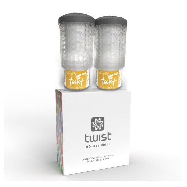 The Twist Passive Air Freshener 2 pack is ready for resell in the perfect point of sale package Your customers see at a glance the look and benefits of the product increasing the likelihood of a purchase Using the same premium fragrances as our previous passive air fresheners, we designed a cartridge that is spillresistant after activationThe Twist activation is nearly effortless with our patented twostep twist and click execution, an audible CLICK signaling that the cartridge is activated and sealed against leakage The Twist utilizes our reliable, gravityfueled system that never requires batteries, fuel cells or any other artificial means of power to neutralize odors in up to 6,000 cubic feet of space for a full 60 days Show your customers what the Twist can do for themFRAGRANCE DESCRIPTIONSGREEN APPLE Like the tang of a sour apple hard candy, our crisp, mouthwatering Green Apple fragrance is abundant with juicy autumn fruits and the palest hint of spiceCUCUMBER MELON Crisp, green cucumber, juicy cantaloupe, and cool watermelon dotted with essences of rose and strawberry leaves create an invigorating yet subtle scent Perfect for spaces where fragrance sensitivity is an issueORANGE GROVE Envelope your space with this zesty, sparkling citrus scent It has the perfect summery, cheerful notes leaving your environment fresh and cleanMOUNTAIN BREEZE Mountain Breeze evokes the crisp, cool air of a springtime alpine meadow Freshcut pine, lilyofthevalley, and woodland musk all combine to offer a fragrance that is at once refreshing and comfortingCHERRIES JUBILEE A rich melange of tart red cherries, black currants, and juicy plums, stirred together with honey and almond create a confectionery treat for the senses Boldly sweet to mask the most difficult odorsNATURALLY CLEAN FMatic's signature scent is evocative of a stack of freshlywashed and folded cotton sheets in a cedarlined cupboard, punctuated with faint notes of lavender and lily This scent is almost imperceptibly clean, making it ideal for areas where fragrance sensitivities are an issueMANGO MYSTIQUE Instills the fragrant atmosphere of a tropical fruit stand, the honeyed juices of freshly cut fruits glistening in the warm sun The softly sweet aromas of mango, papaya, passionfruit, and orange star in this mouthwatering fragranceMADAGASCAR VANILLA Madagascar Vanilla, rich with opulent cream and bold bourbon, is reminiscent of favorite comfort foods and
