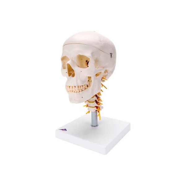 3b anatomical model - classic skull, 4-part, on cervical spine 4 part skull on cervical spine with natural bone color features movable jaw and seven cervical vertebrae flexibly mounted. Model includes representations of the hindbrain, spinal cord, cervical nerves, vertebral arteries, basilar artery and rear cerebral arteries. Model uses natural bone color.