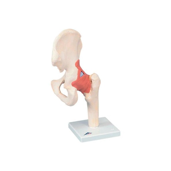 3b anatomical model - functional hip joint, deluxe this high-quality functional hip joint model of a natural-sized right joint with ligaments shows the anatomy and possible physiological movements of the human hip joint (e.g. Abductions, anteversion, retroversion, internal and external rotation) in exceptional detail. The color of the natural-cast bones is extremely realistic in this functional hip joint. The cartilage on the hip joint surfaces is marked blue. The functional hip joint consists of thigh stump and hipbone. Deluxe functional hip joint mounted on a base for easy display in the classroom or doctors office.