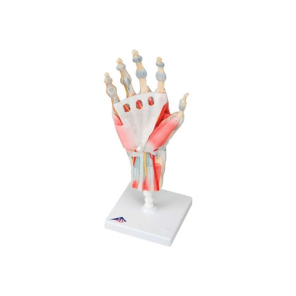 3b anatomical model - hand skeleton with removable ligaments & muscles, 4-part hand skeleton with ligaments and muscles has all the anatomically important ligaments and tendons. Model includes the interosseous membrane between the radius and ulna, removable flexor retinaculum. The bones, muscles, tendons, ligaments, nerves, arteries, and veins are all featured in this high quality 4 part model of the hand and lower forearm.
