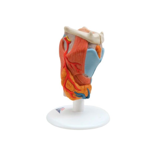 3b anatomical model - larynx, 2-part the larynx model is divided into two halves. This medially sectioned larynx model shows: larynx hyoid bone windpipe ligaments muscles vessels nerves thyroid gland this anatomically correct human larynx is a great addition to any doctors office or classroom. The larynx model is on a stand.