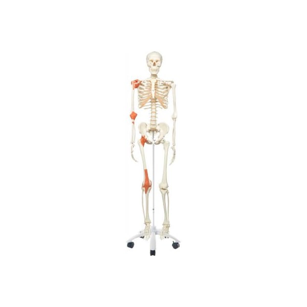3b anatomical model - leo the ligament skeleton on roller stand leo is a full-size skeleton with ligament model. Its elastic ligaments on the larger joints (shoulder, elbow, hip and knee) have been incorporated on the right side of the skeleton. Used in hospitals, schools, universities, and laboratories. The skeleton is ideal for active use in teaching and demonstrations. The skeleton is waist mounted on a metal roller stand (painted white). Measures at: 69.5" and 21.98 lb. features: 3 part skull individually inserted teeth removable arms and legs natural cast transparent dust cover
