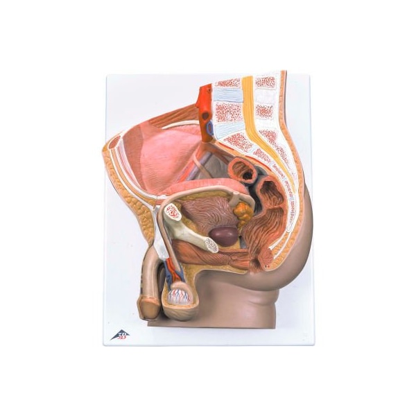3b anatomical model - male pelvis, 2-part the male pelvis anatomy model is shown in median section. One half of male genital organs with bladder is shown at the normal position in the male pelvis. The rectum is removable for a more detailed study of the male pelvic anatomy. This high quality anatomy model is delivered on baseboard offering the possibility to be mounted to the wall.
