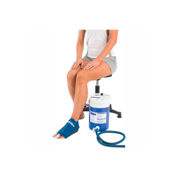 Aircast cryocuff medium foot cuff with gravity feed cooler cold therapy with the aircast cryocuff combines compression and cold. Compression minimizes swelling, while cold minimizes pain. Set consists of water cooler and cuff. Cooler holds enough ice and water for 8 hours of cryotherapy. Compression is gravity controlled. Cuffs are made of nylon and vinyl. Use with gravity feed (included) or continuous autochill electric pump sold separately ).