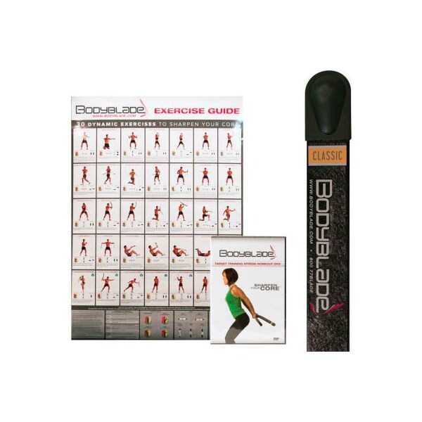Bodyblade classic exercise kit with wall chart and instructional video, black improve strength, balance, coordination, posture, and core stabilization with low level vibration and inertia. Delivers progressive resistance. For pre- or post-operative exercises, spinal cord injuries, stroke, home exercises and continuity from the clinic. Includes a wall chart and dvd. The classic style is black and 48 inches long.