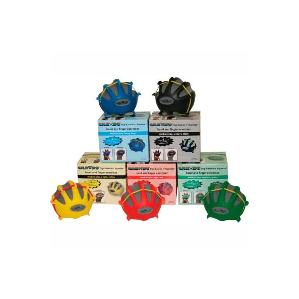 Cando digi-extend n' squeeze exerciser, 5-piece set, small cando digi-extend n' squeeze hand exerciser combines best features of digi-extend and digi-squeeze. It helps to develop isolated finger strength, flexibility and coordination. Provides complete reciprocal exercise program (flexion and extension). Ergonomic ball-shape positions fingers and hand for ideal pressure distribution. Each exercise comes with exercise pamphlet. Cando digi-extend n' squeeze available in 3 sizes. Each size available in 5 color-coded resistance levels for flexion. Each unit is packaged standard with latex free extension bands covering 4 color-coded levels from the lightest to heaviest extension requirements. Small 5 piece set - yellow, red, green, blue & black. stand not included.